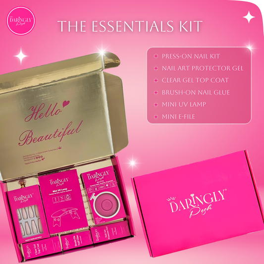 Discover our array of essential press-on nail tools, including brush-on nail glues, gel polishes, mini e-files, and more. Elevate your press-on nail game with Daringly Posh Essentials.